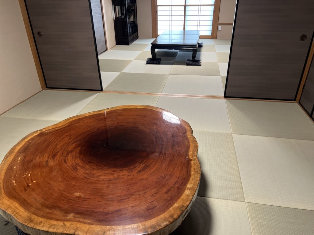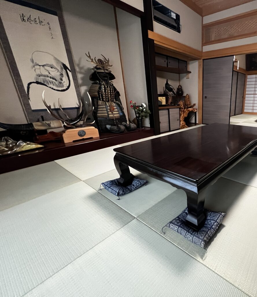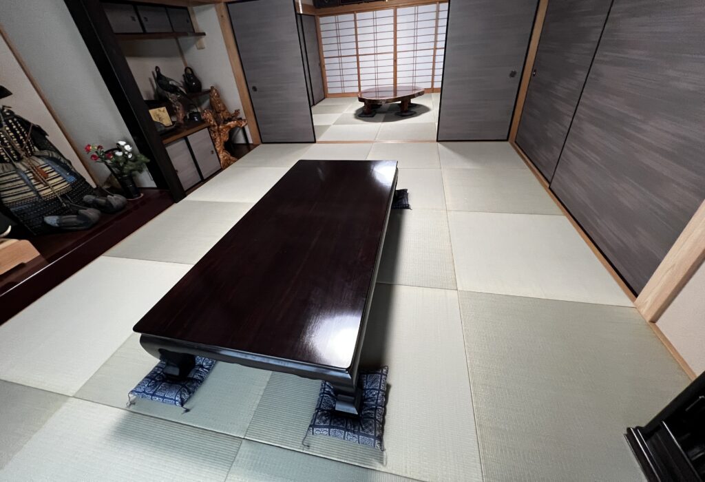十畳間と八畳間の続きの部屋に、縁なし畳を納めさせて頂きました。立派な鎧や兜(家主様の許可を得て撮影)などがある床の間にこの畳の組み合わせが、重厚感がある雰囲気がさらに増してくる様な気がします。Y様、今回はありがとうございました。